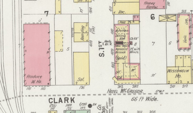 Jan 1898 Sanborn Map shows a saloon at 126 Clark Street and a boarding house at 114 S First, later listed as 115 S. First. The connecting building between the two is gone. The Commercial Hotel is now Hotel McGregor.
