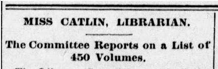 After the fire the collection found its way to new shelving above the popular Taylor’s Drugstore on Strongs Avenue. Well known by locals, the space was eventually acknowledged as the public library and listed in the 1901 city directory as the Public Library with Librarian Catlin at their service. Officially known as the city’s first paid librarian, Miss Frances Catlin, called Fanny, was paid $16 monthly to manage the library. When Fanny left the position in 1898, her sister Molly took her place, and Mrs. Mary Dunegan joined as Assistant Librarian.