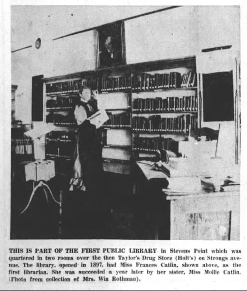 Miss Catlin and Mrs. Dunegan not only ran the small city library above Taylor’s, but also traveled across Portage County to rural communities setting up “Traveling Libraries” which consisted of small book collections. The pair placed the small collections of books in homes or businesses for a period allowing locals to browse and borrow easily without having to come to Stevens Point to use the main library. Even with the traveling libraries and the new home above the drugstore, Stevens Point still had a great need for a dedicated free public library building.