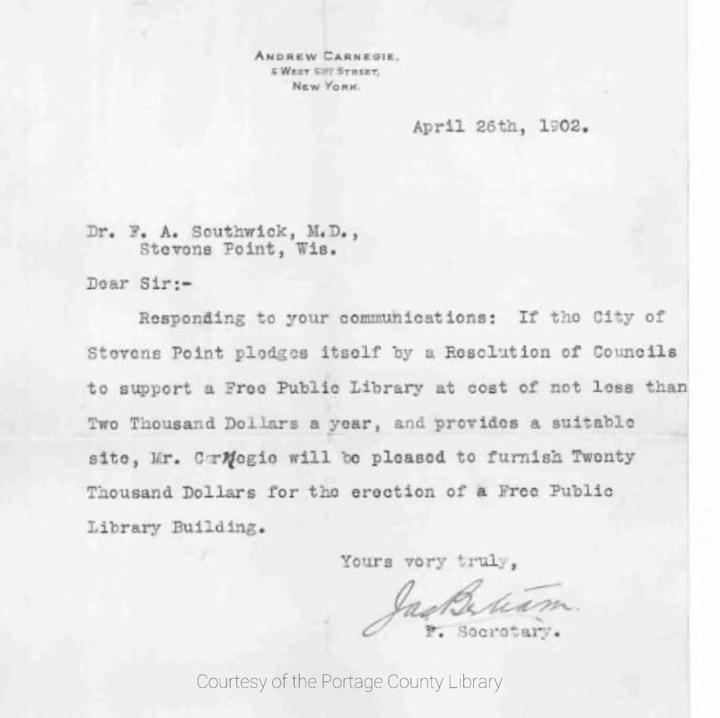 With a few local donations, some from members of the building committee, the Library Board and Common Council decided to ask for larger sum. At the end of April 1902, Dr. Southwick received a letter written by Andrew Carnegie’s secretary letting him know that Mr. Carnegie would be donating $20,000, approximately $613,000 today, towards the completion of a free public library building in Stevens Point.
