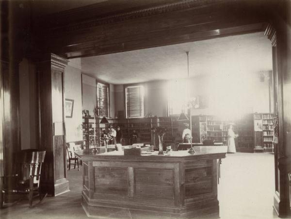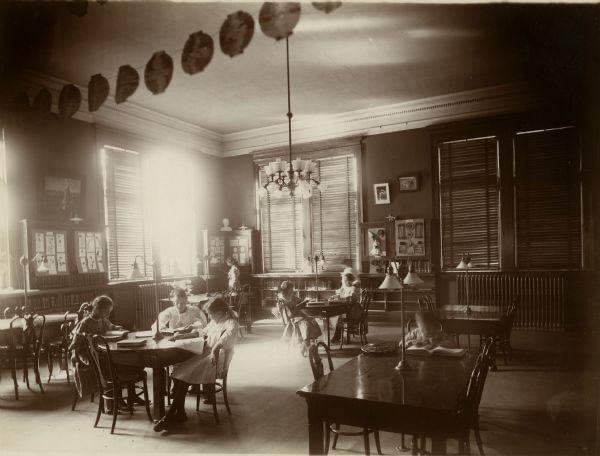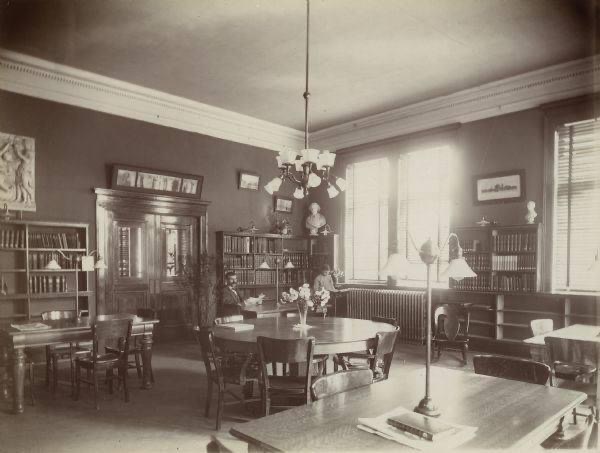 At completion the new library was just as architect drawings showed. The handsome Neo-Classical Revival style building constructed from gray stone and brick was built with a “high basement” to match the height atheistic of the neighboring two-story buildings. The ample stone stairs led to the “broad and inviting” entrance flanked with enormous ionic Roman pillars. Heavy wood doors opened to a wide vestibule with the “librarian’s desk being at the north end of this space.” To the left was a spacious reading room filled with tables and chairs, which housed reference books and the directors’ room. Located in the right wing was the children’s room as well as space for the librarian’s office. The heavily varnished interior woodwork, made from red birch, gave off a warm inviting glow.