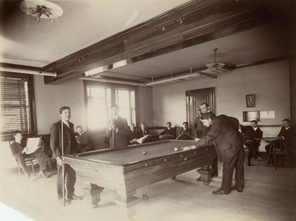 The lower level contained “a lecture hall, a club room for women and a newspaper reading room for men,” as well as a kitchen, storeroom, boiler and fuel rooms, and a librarian’s work room. At some point a carom or French billiards table was moved into the men’s area where boys and men alike gathered to play. Various meetings were held by the ladies in their specified area as well. The Women’s League was very involved in the fundraising for the library and held a permanent contract for their space. Separating the main lower wings of the building was a large open corridor with all three areas able to connect by opening the sliding doors create one large room. The large room was intended to be used for events and lectures for community members.
