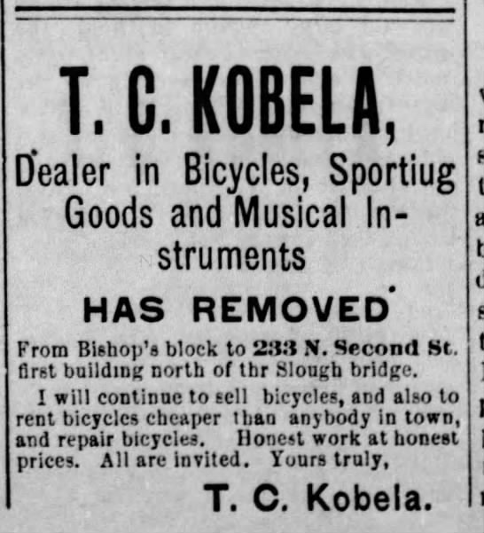 1900 City Directory, ‘Kobela’ T. Charles, bicycle repair, res 245 N 2nd‘