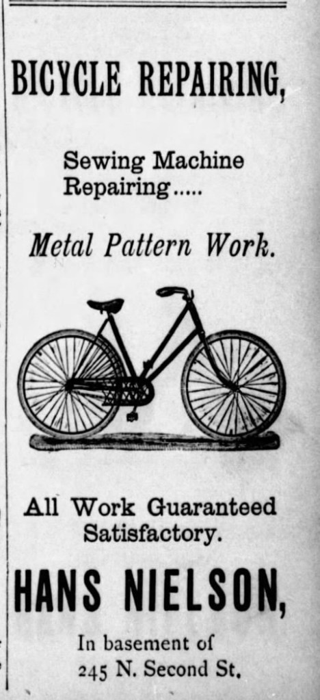 June 1897 Ad for bicycle repair appears in SPDJ, Hans Nielson, in the basement of 245 N Second Street