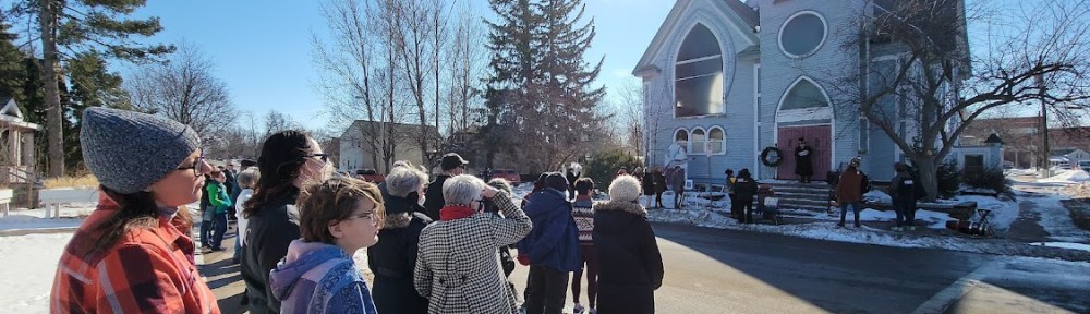 On the afternoon of February 20, 2022, Historic Stevens Point held a funeral and memorial service in honor of the soon to be demolished historic Gothic Renaissance church building at the corner of Strongs Avenue and Brawley Street near downtown Stevens Point. About 60 people gathered for a short service held on the steps of the building which included a eulogy written and read by our founder, Chelsey Pfiffner, and blessing from the current pastor of Trinity Lutheran Church, as well as beautiful renditions of Amazing Grace and Taps played on trumpet by members of The Grenadiers. The service was immediately followed by a funeral procession in the style of a New Orleans Jazz second line procession complete with prerecorded amplified music, walking a route down Brawley towards Water, and then Clark Streets, leading to the Rose House Venue, where a reception was held with presentations from speakers John Harry, Executive Director of the Portage County Historical Society and Pastor Clay Schmidt from Trinity Lutheran Church, as well as remarks from Pfiffner.