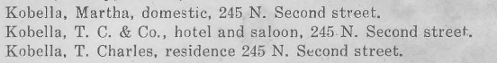 1912 City Directory, Kobella, Chas, bicycle shop, 245 N Second Street, res same; Kobella John, apprentice, res 245 N Second Street