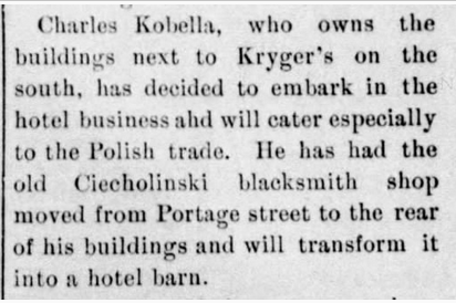 Sept 11, 1913, The Last Known Raid: Kobella Hotel, Notorious Resort is Raided Again! Four arrested. Mrs. Mary Cychosz, Mrs Georgia Halverson, Miss RA Burns who claimed to be from Marquette, Michigan., and Mr. Glen Sawyer of Fond du Lac. Cychosz paid fine of $54.59 for selling liquor without a license and “was given a sharp lecture in which she was warned that if ever charged with the same offense that she would get a state prison sentence as well as a fine.” Mary Cychosz was married to John Cychosz, presumably who Kobella ran his bike shop with in 1900. They were reported to be living on Portage Street in 1915.